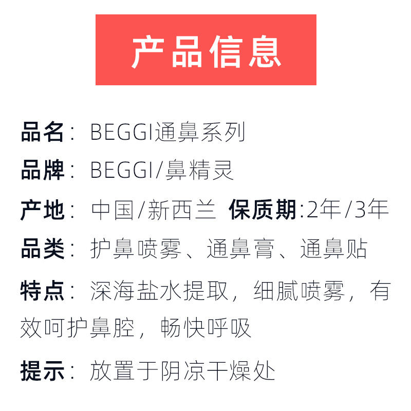 包装清单 新西兰beggi儿童护鼻膏成人鼻塞外涂通鼻精油膏通鼻贴海盐水鼻喷
