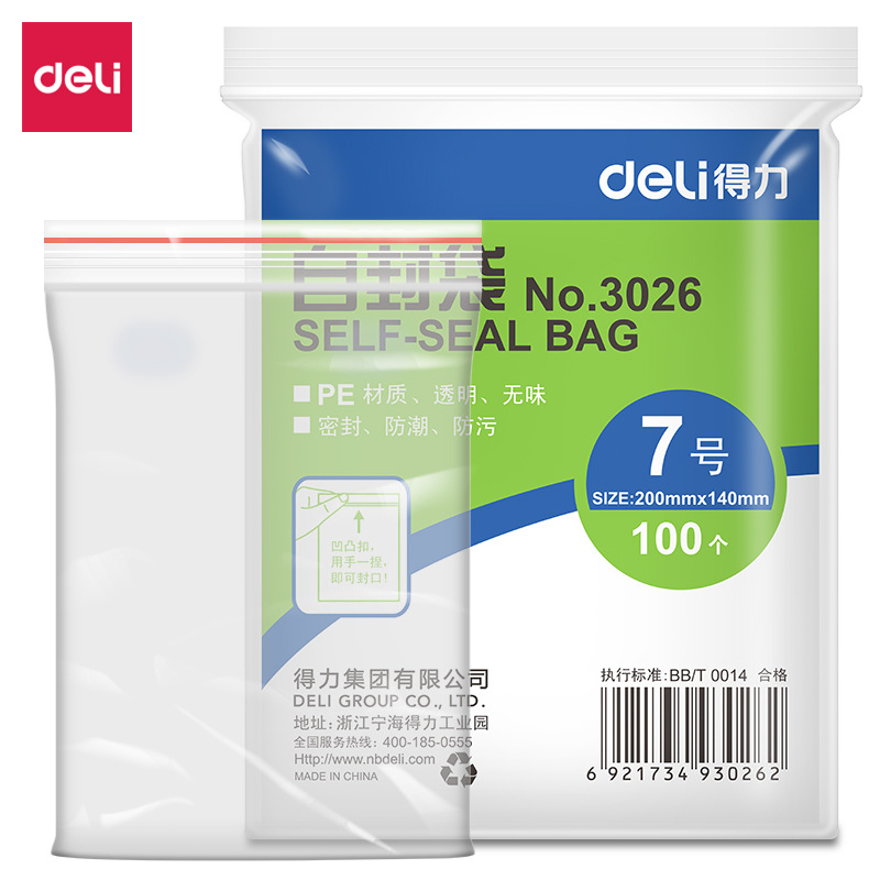 得力3026加厚塑料袋包装袋7号(200*140mm)自封袋 100个封口袋| 包装清单 | 得力3026加厚塑料袋包装袋7号(200*140mm)自封袋 100个封口袋 |