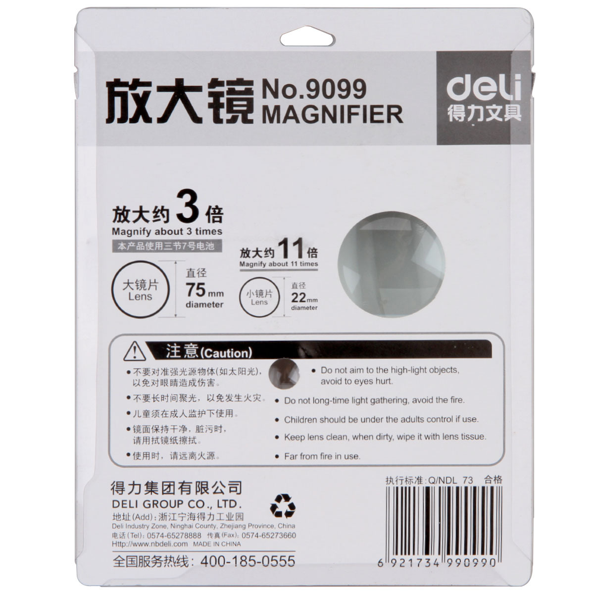 得力9099放大镜 带灯光11倍 手持式阅读看报放大镜 镜片直径75mm| 包装清单 | 得力9099放大镜 带灯光11倍 手持式阅读看报放大镜 镜片直径75mm |