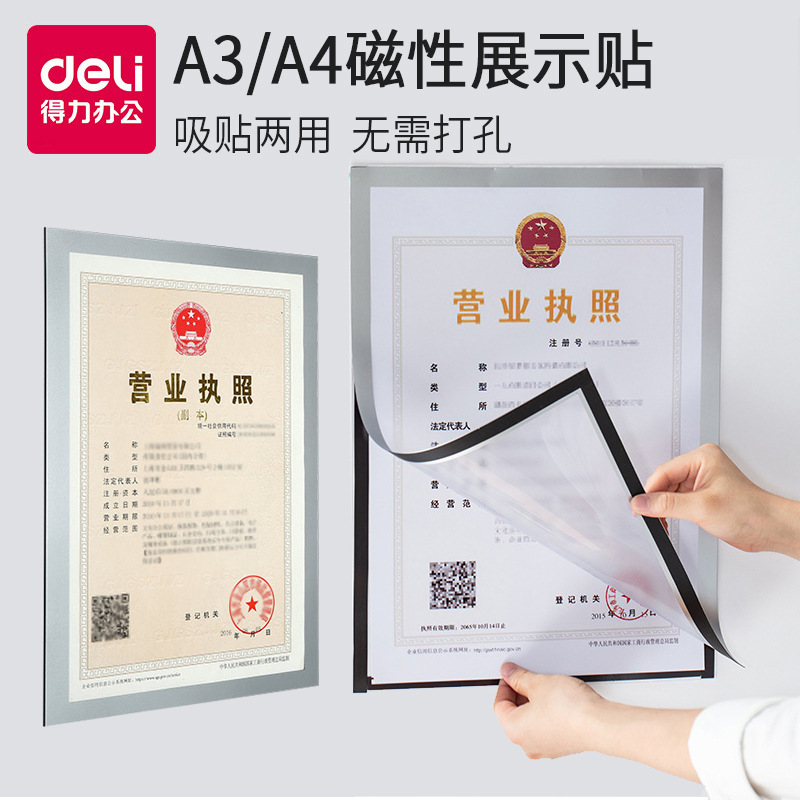 得力免钉展示贴A4磁性白板贴A3磁贴磁力板营业执照保护套证件卡