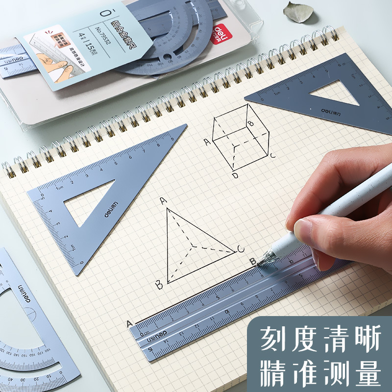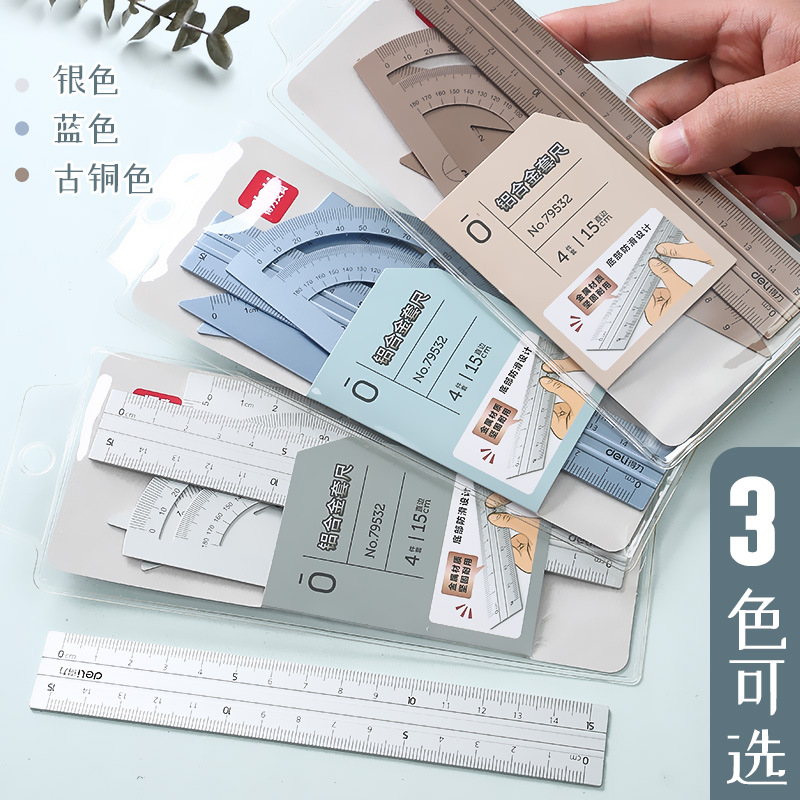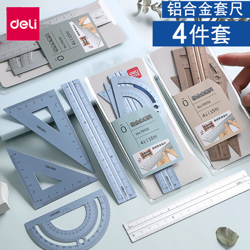 得力79532金属套尺等腰三角尺直角三角尺直尺量角器绘图尺子4件套 补货中