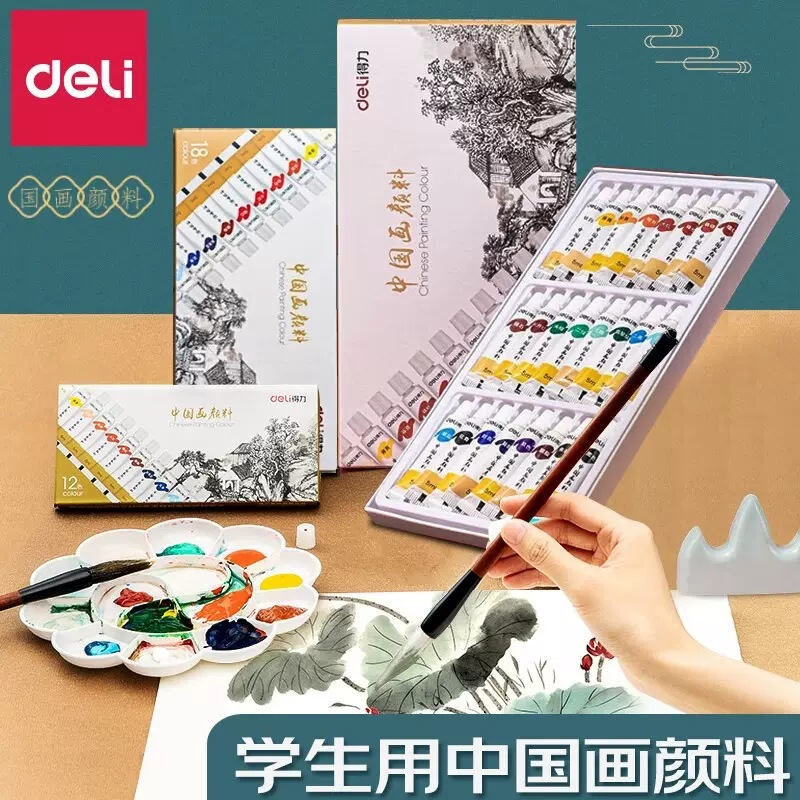得力12色24色中国画颜料套装学生初学者儿童美术可水洗幼儿园画画