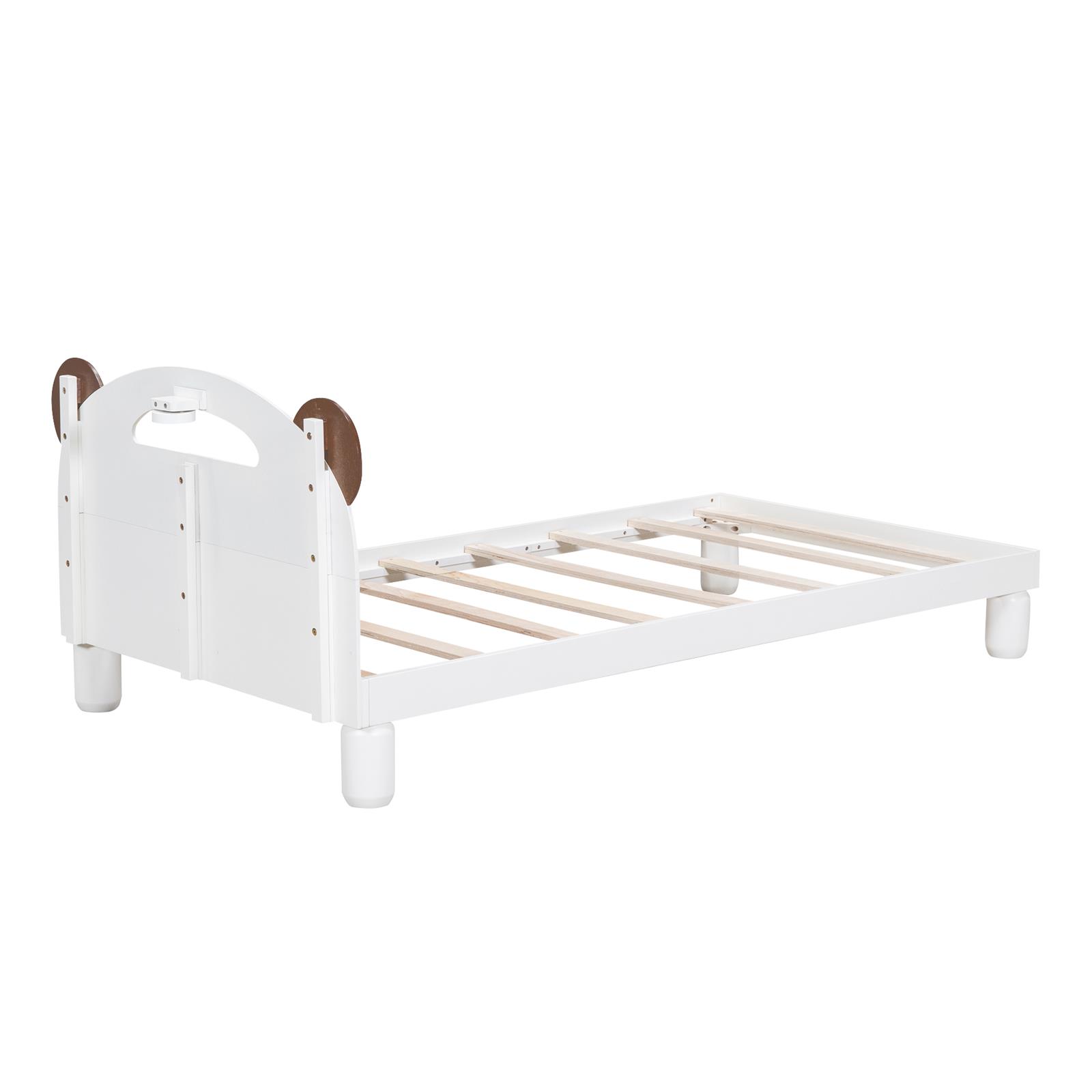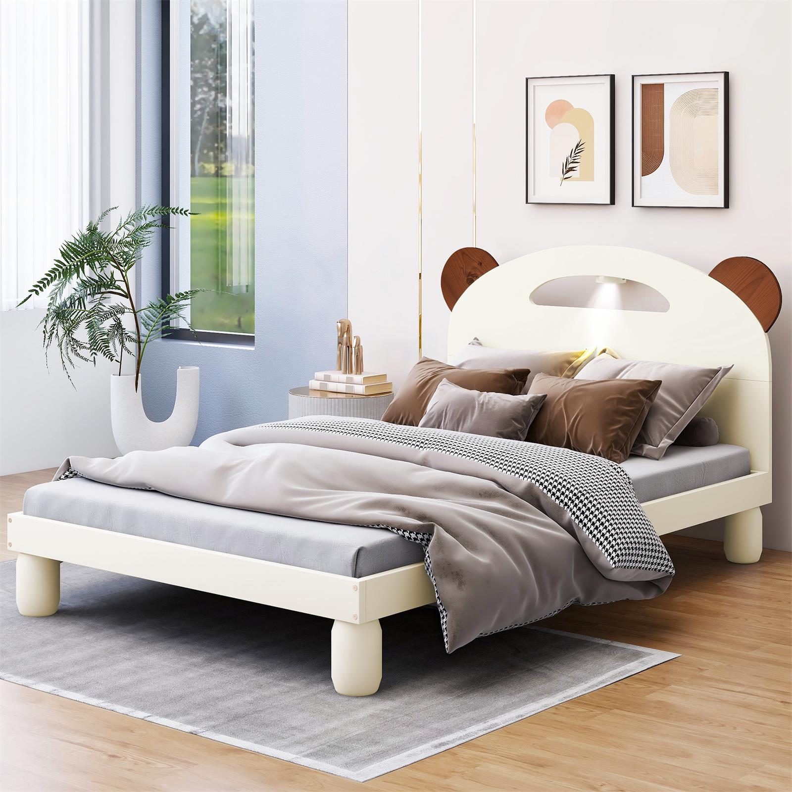 双床平台床,带熊耳形床头板和 LED,乳白色