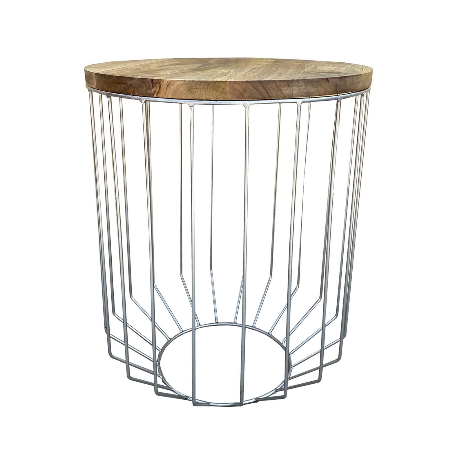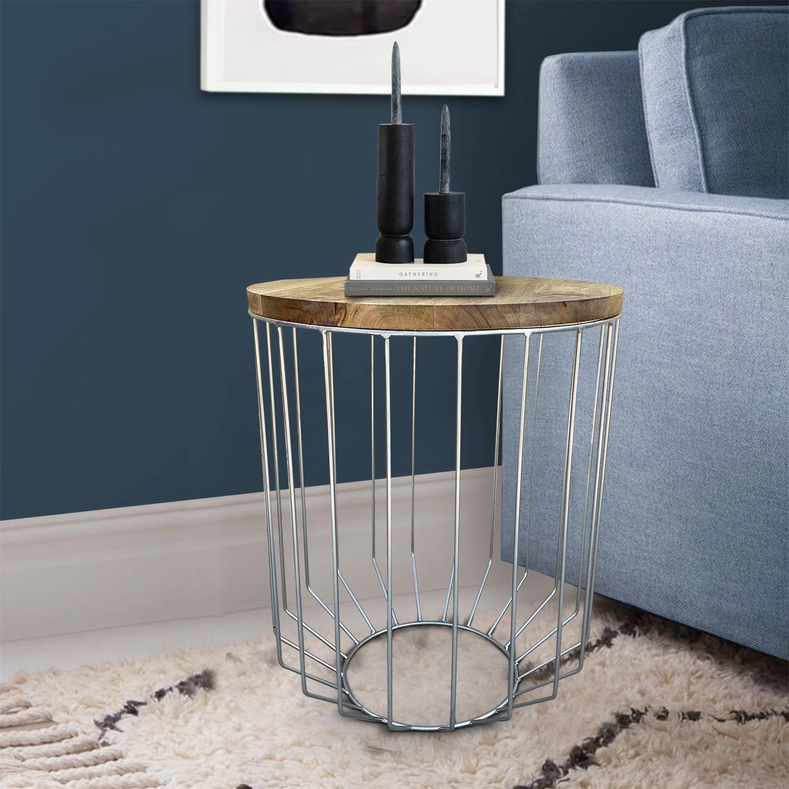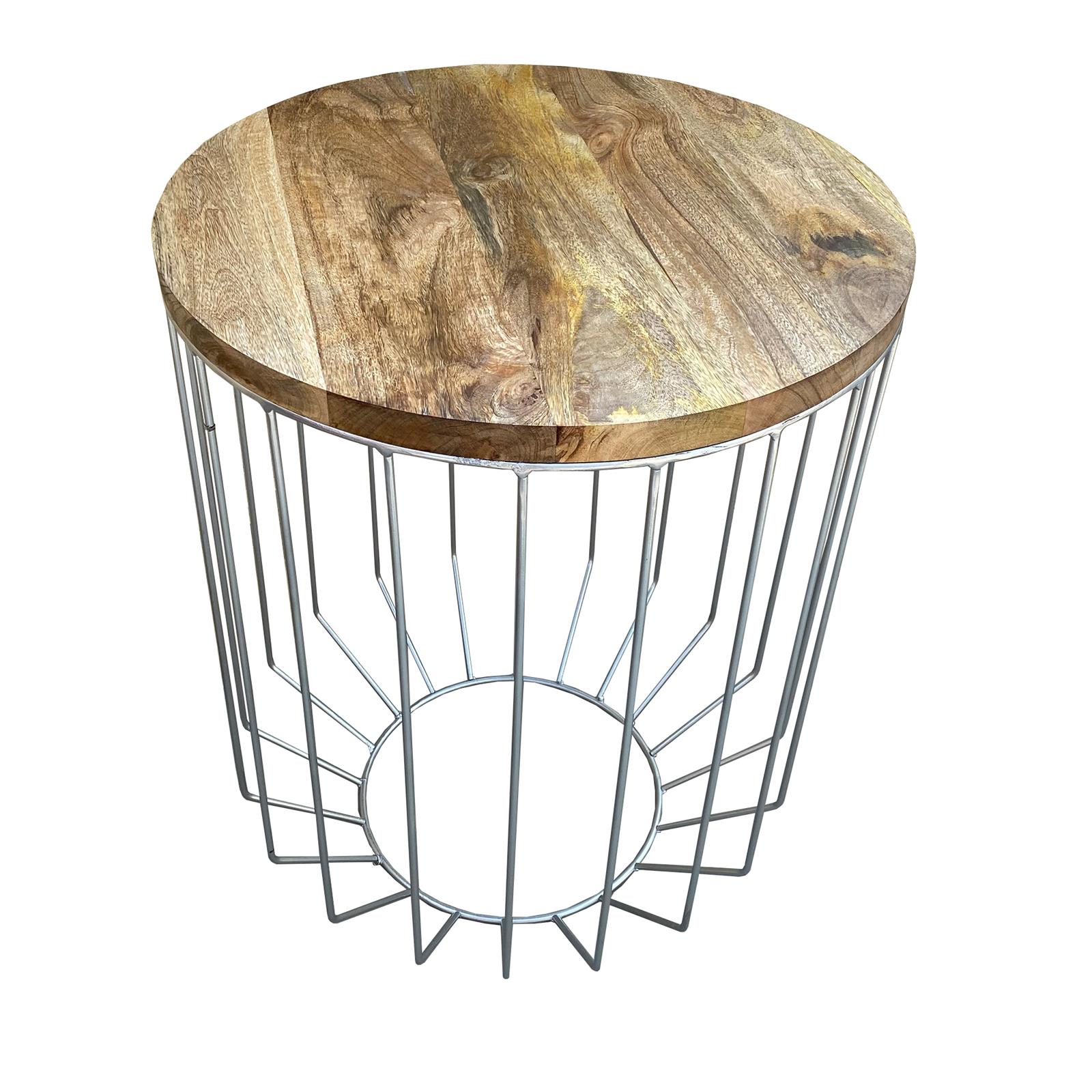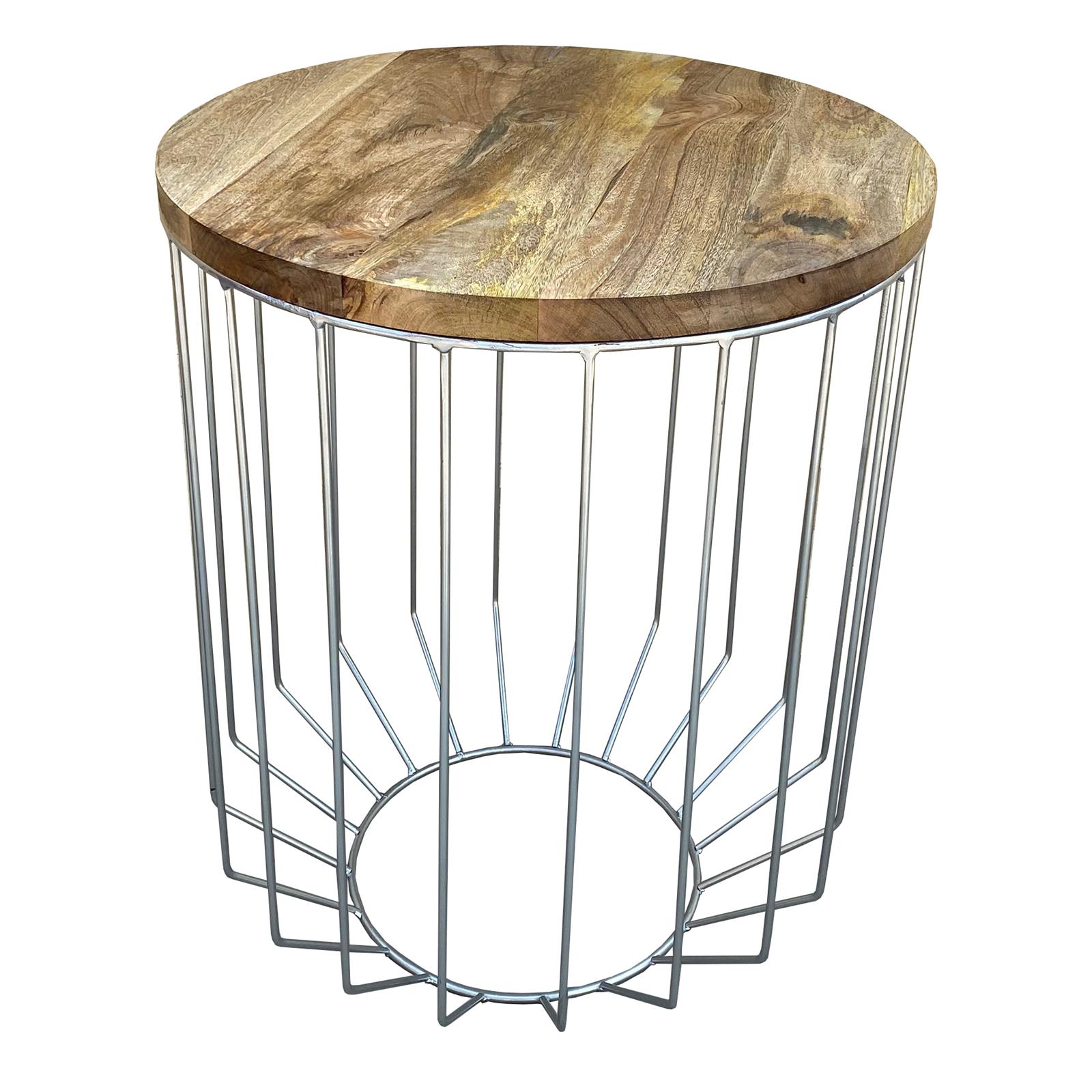 25英寸芒果木圆形侧端装饰桌,锥形板条笼设计,手工制作,自然色,镀铬