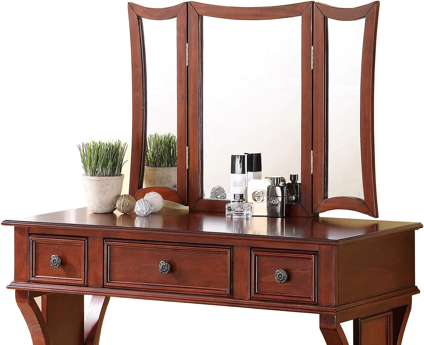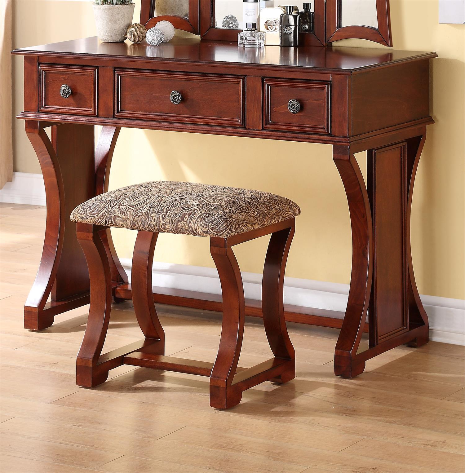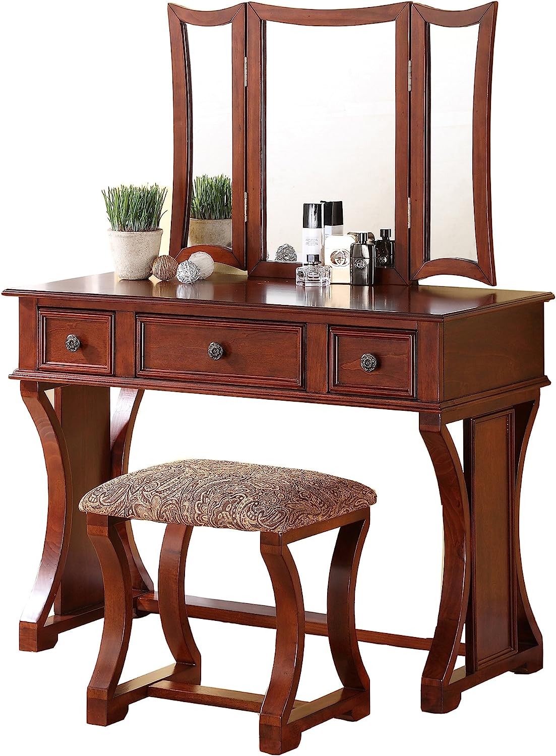 Packing list 独特的现代卧室梳妆台套装,带凳子可折叠镜子抽屉樱桃色中密度纤维板贴面 1 件梳妆台家具