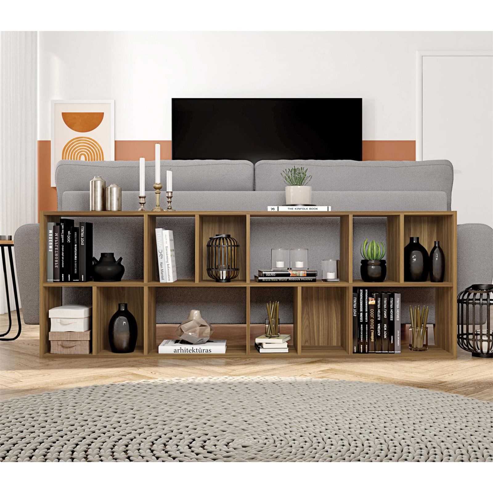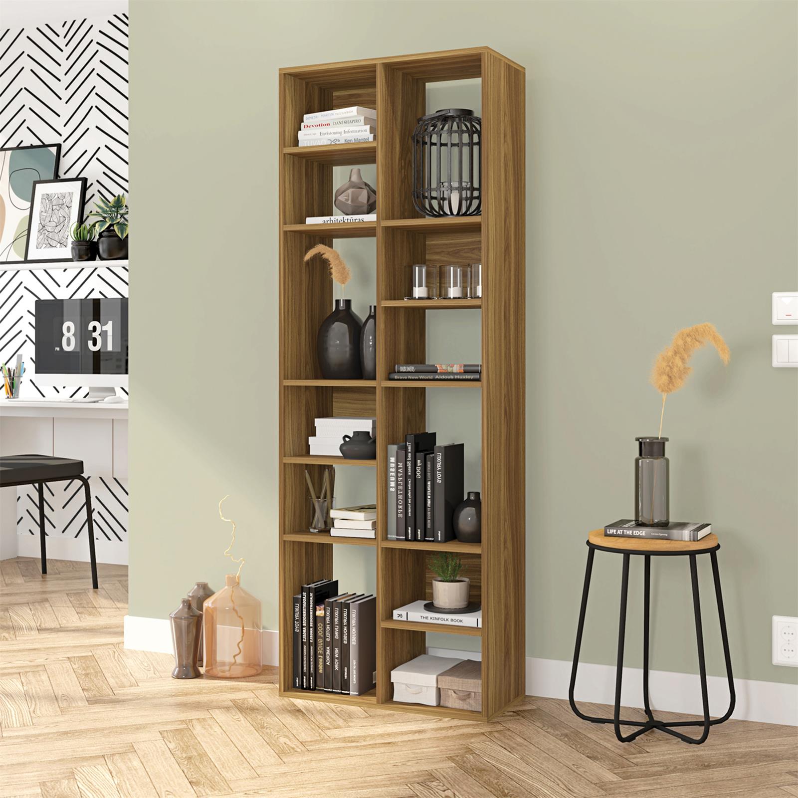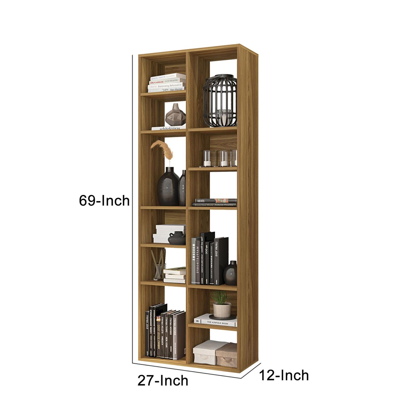 瓦莱丽 69 英寸木质书架,12 个架子,手工制作,粒面细节,胡桃棕色