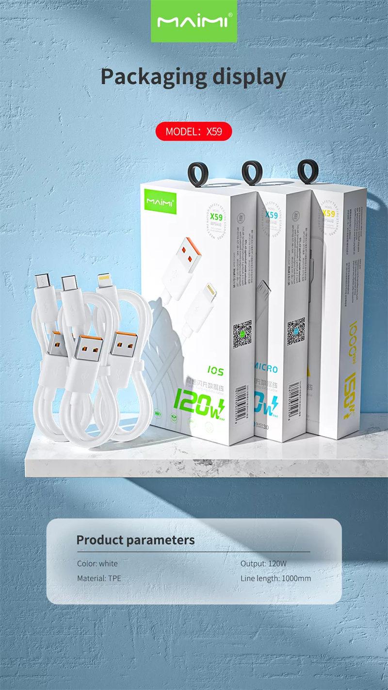 【MMY】maimi x59型号,充电电缆120W,白色IOs/c型/微USB 1M,100%纯1m保险