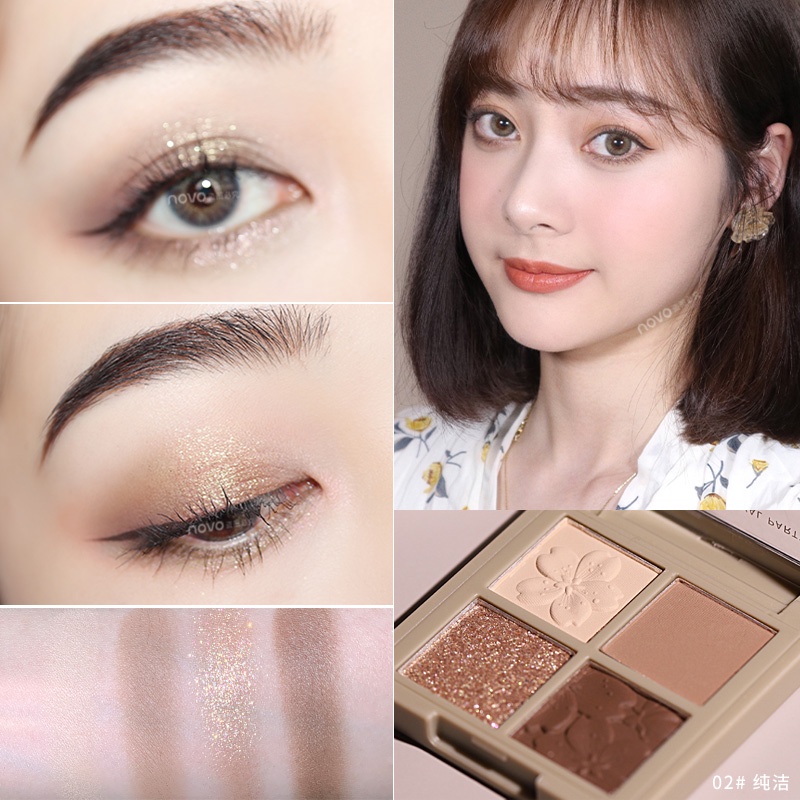 眼影盘4色4种 棕色、橙色、裸粉色、奶油色、微光、哑光色,色彩靓丽,持久。 4 种调色板,4 种设计 独特的眼妆 质地清晰,颗粒细腻 正品 NOVO 品牌 包装规格 6g。