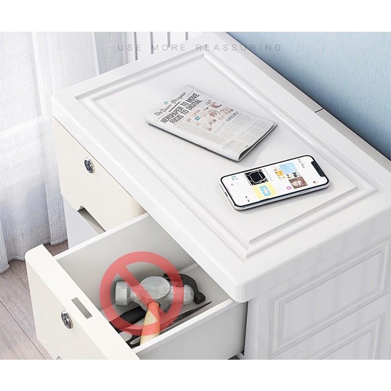 •由新的塑料颗粒制成。没有回收颗粒所以没有霉味。由新的食品级塑料制成。它不是有毒成分,无异味,对小孩子触摸大抽屉也无害。储物空间大,可上锁以防盗窃. 侧盖完全关闭。抗虫蚁或者小动物进去