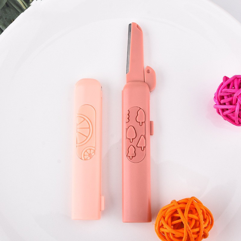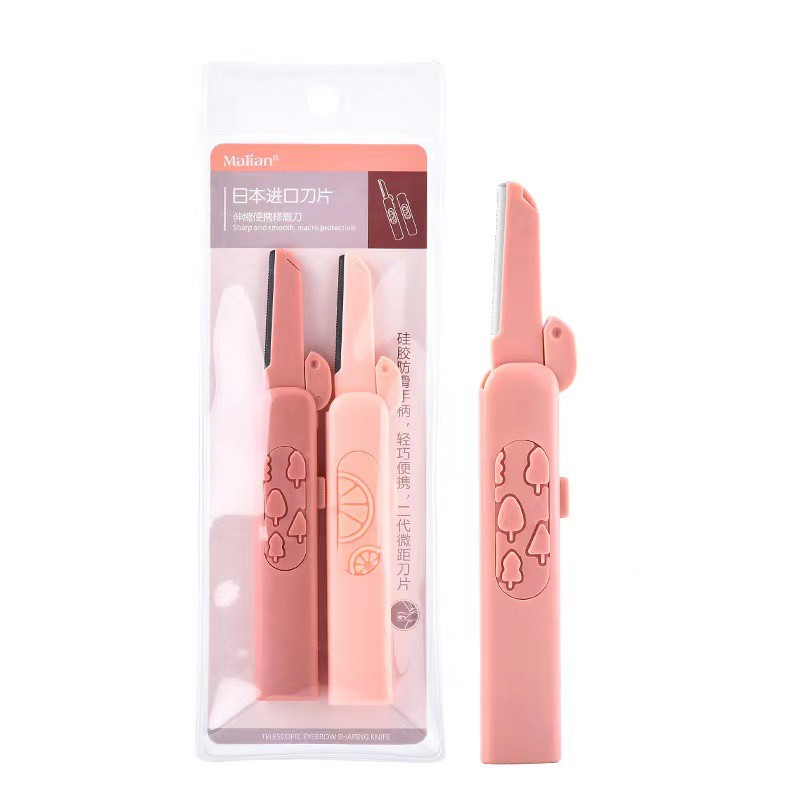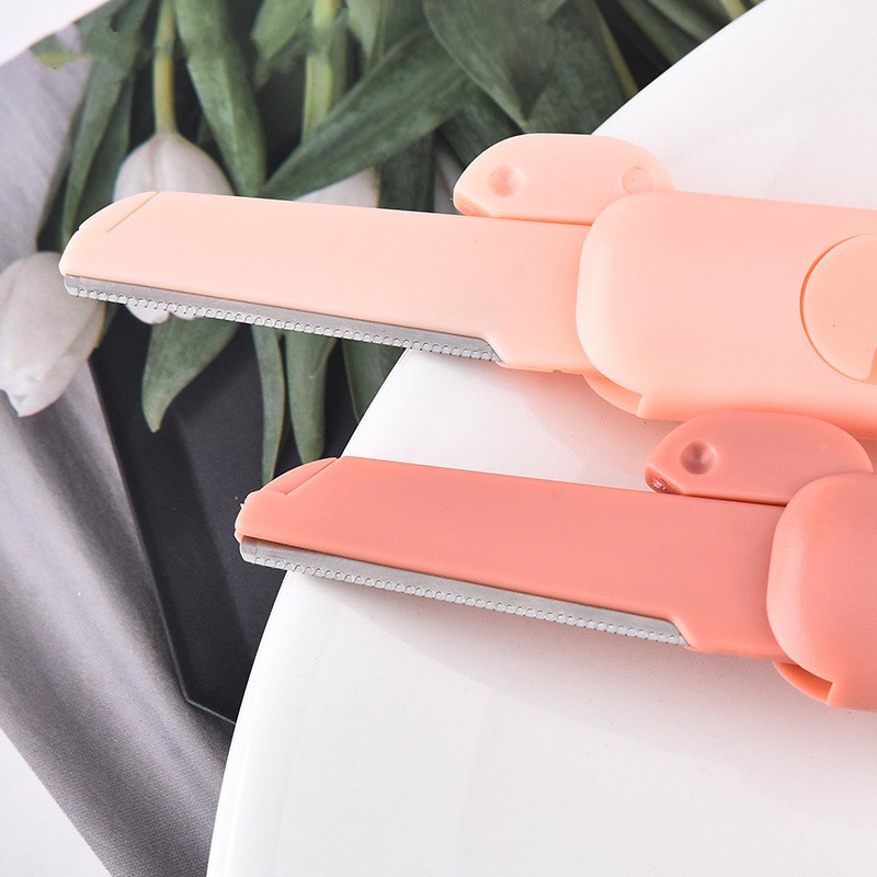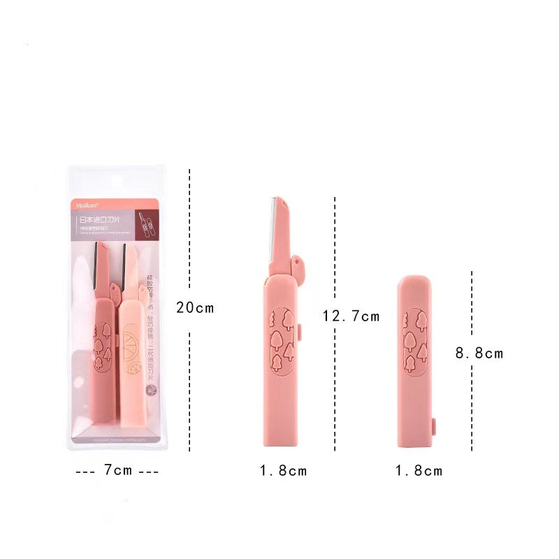 眉刀,2 件装,锋利的不锈钢刀片 可滑动,小巧,携带方便 柔软的硅胶手柄,可爱的图案。 刀片可以90度折叠。 可用于剃双眉、嘴边软毛、胡须 警告 应放在儿童接触不到的地方。 使用后请务必滑动刀片。