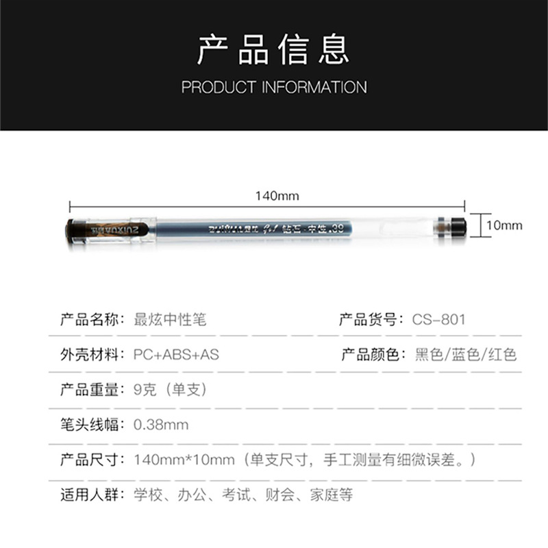 | 包装清单 | 厂家巨能写中性笔套装学生针管笔定制办公文具用品中性签字笔黑色 |