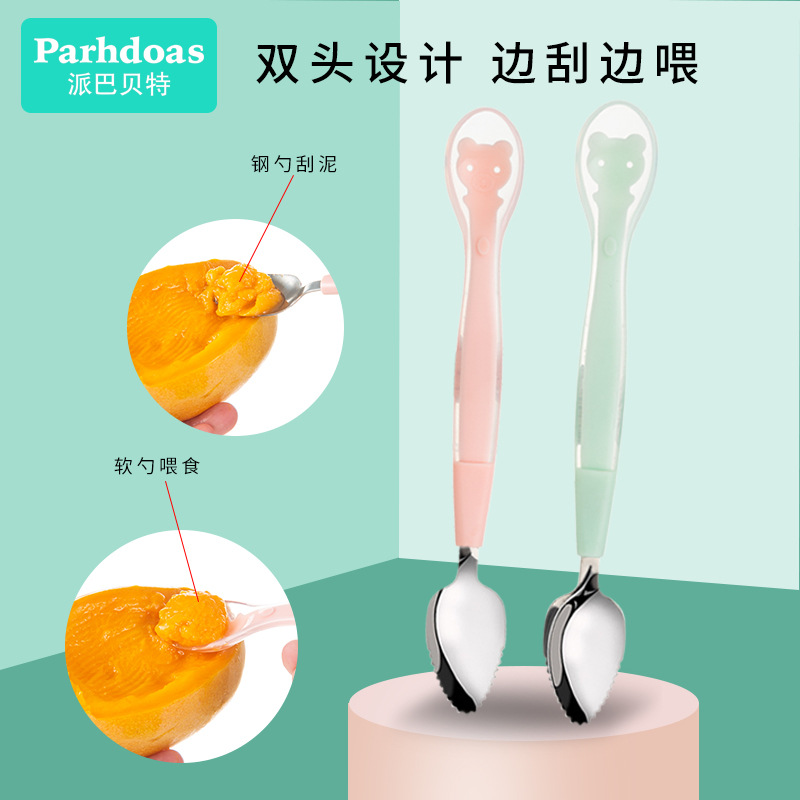 派巴贝特新款双头水果刮泥勺硅胶勺不锈钢勺挖泥勺辅助喂养72878