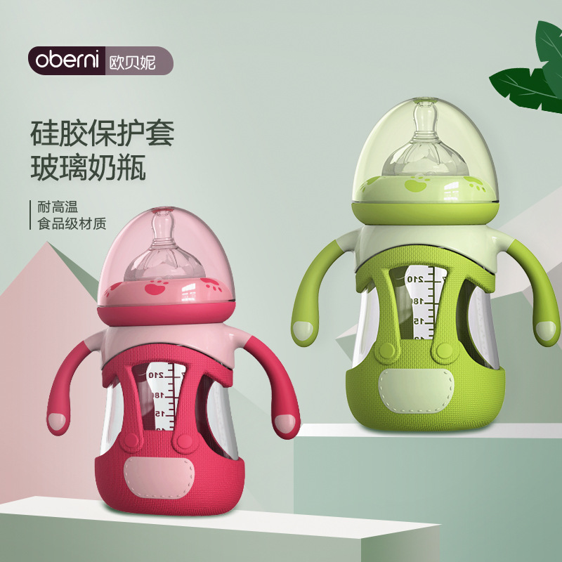 欧贝妮 带硅胶套玻璃奶瓶 高硼硅玻璃宝宝奶瓶 240ml奶瓶厂家批发