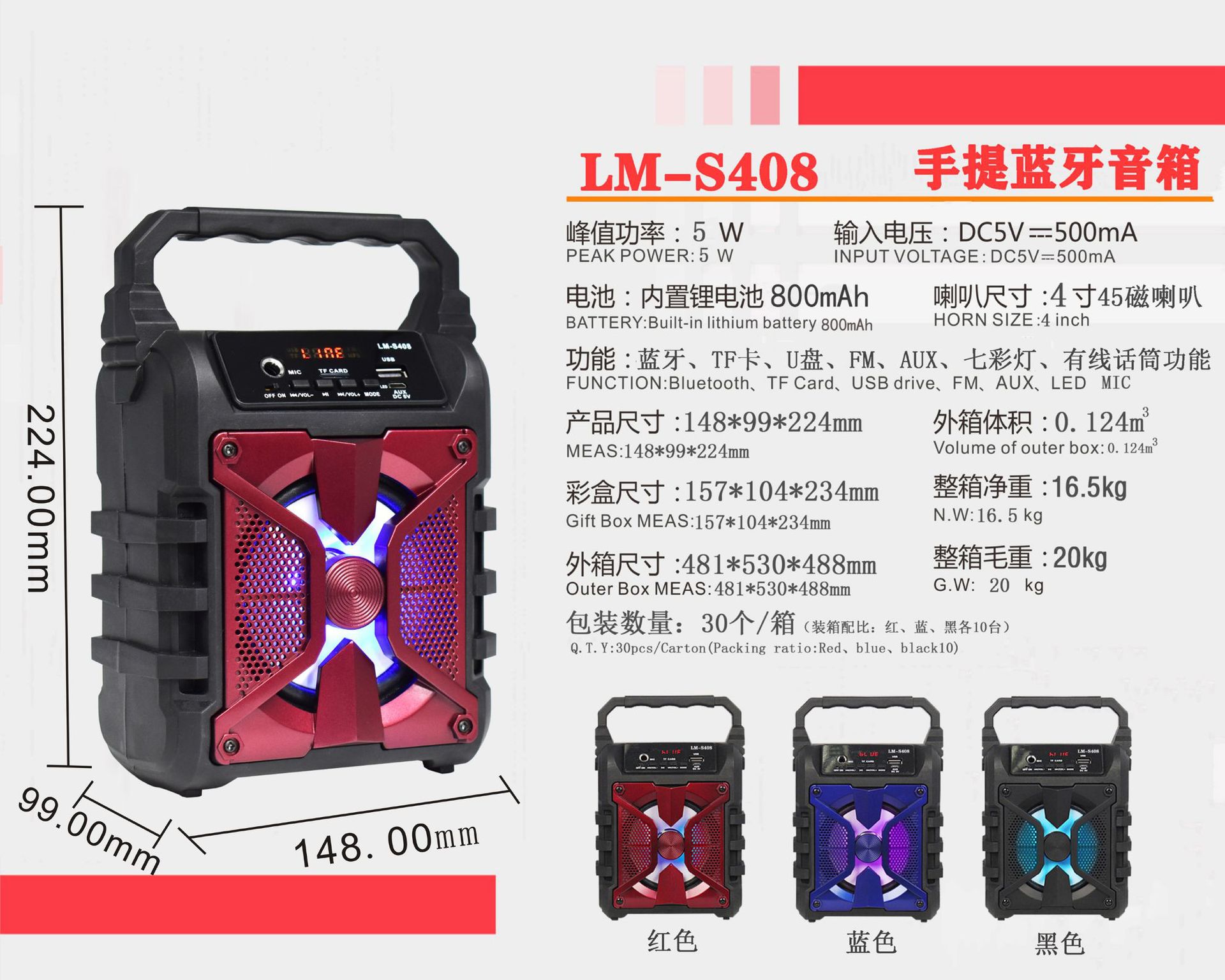 | 包装清单 | 户外广场舞便携式蓝牙音响批发手提插卡k歌收音机七彩音箱批发 |