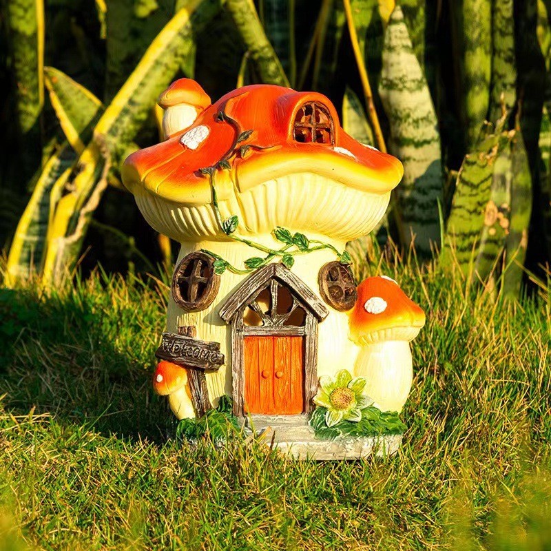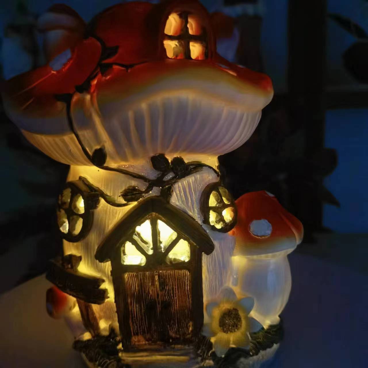 亚马逊户外创意太阳能灯红蘑菇屋树脂工艺品花园庭院景观装饰摆件