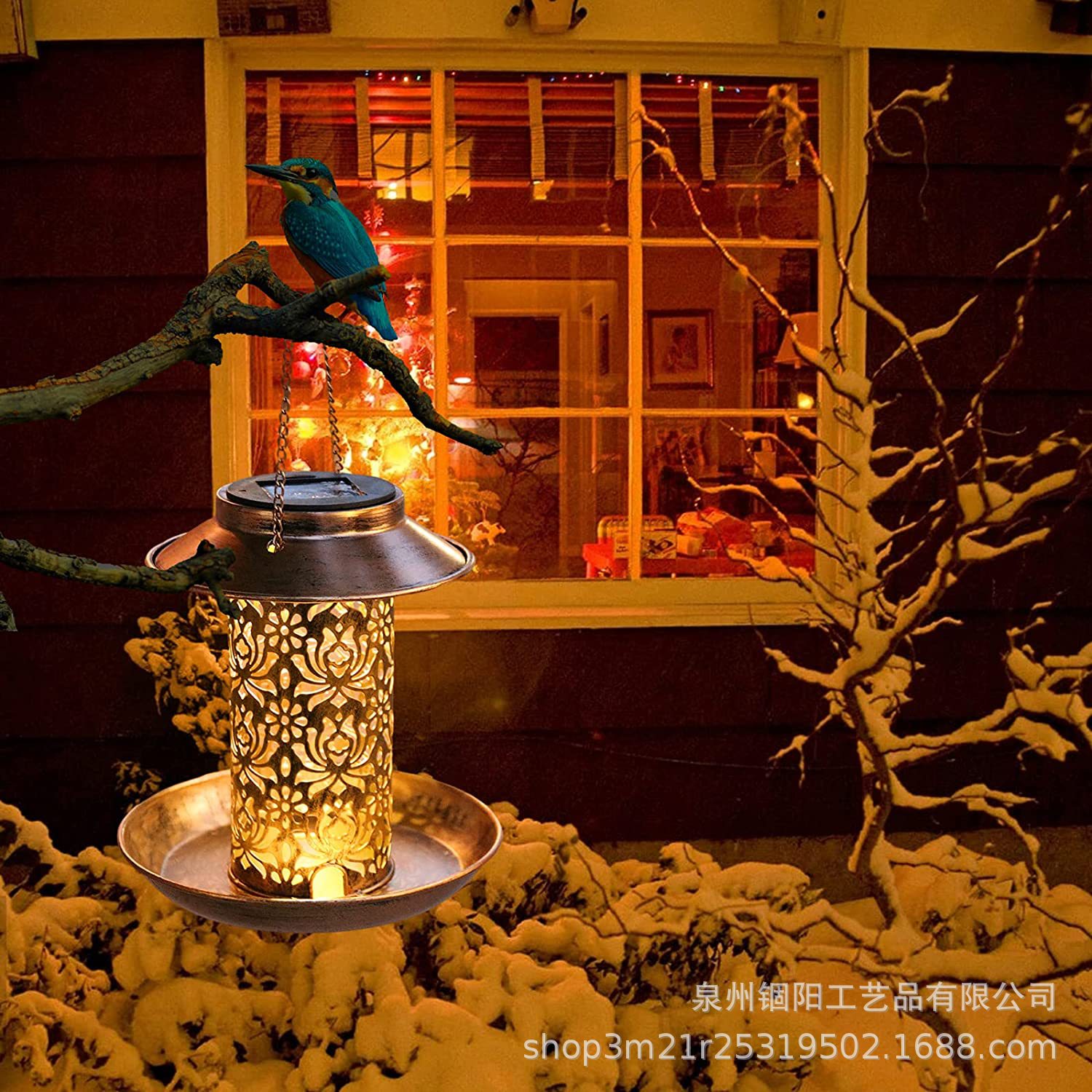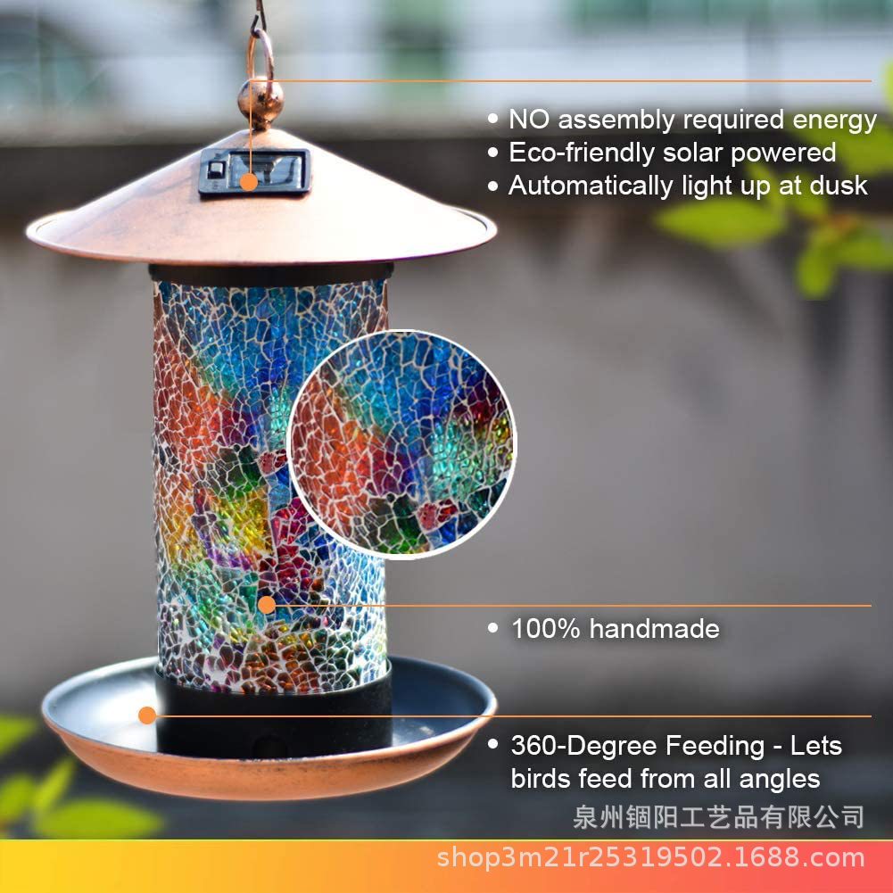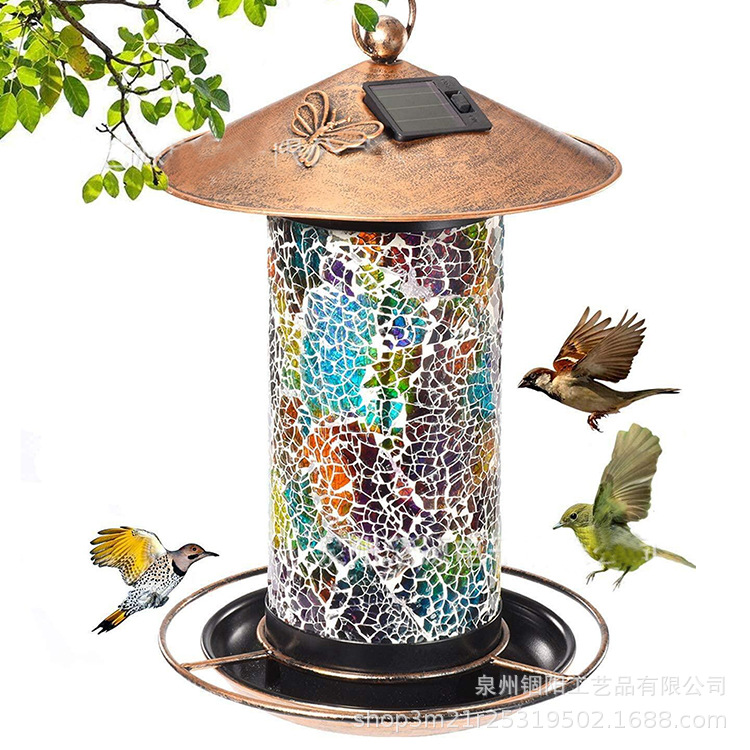 跨境新款太阳能铁艺金属喂鸟器太阳能铁艺镂空悬挂景观灯喂鸟器灯