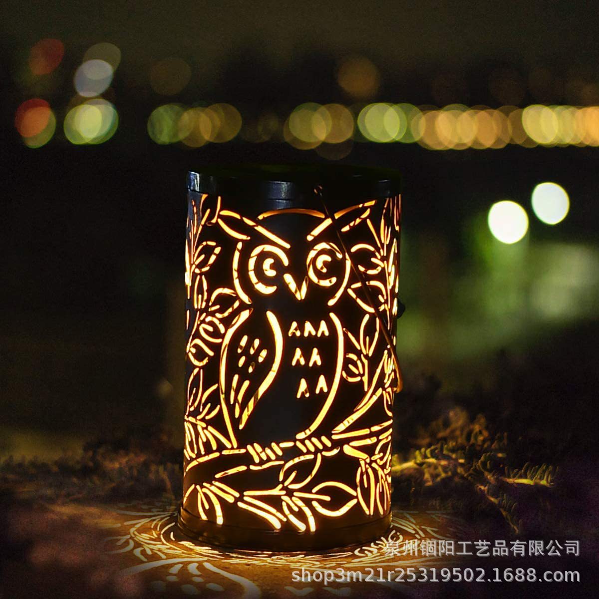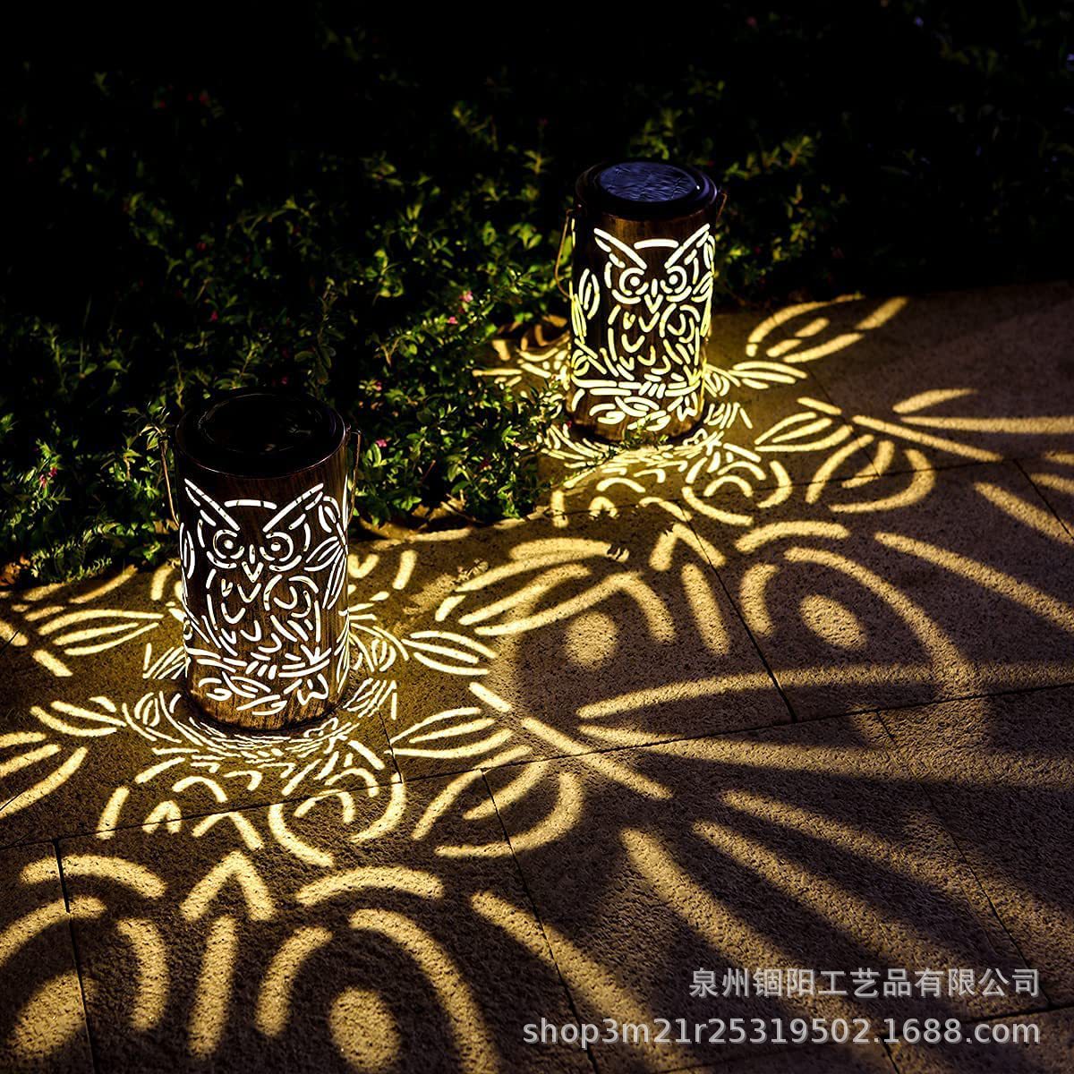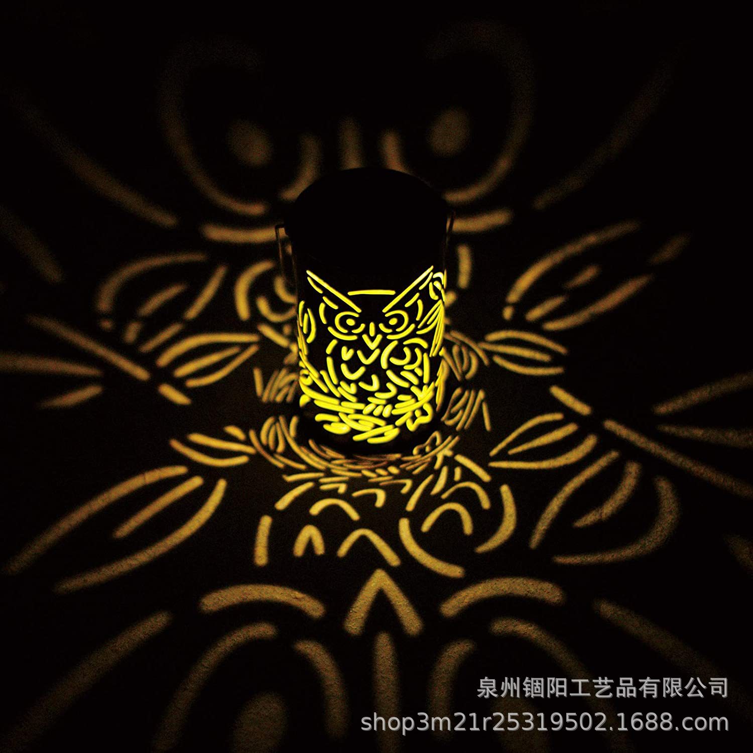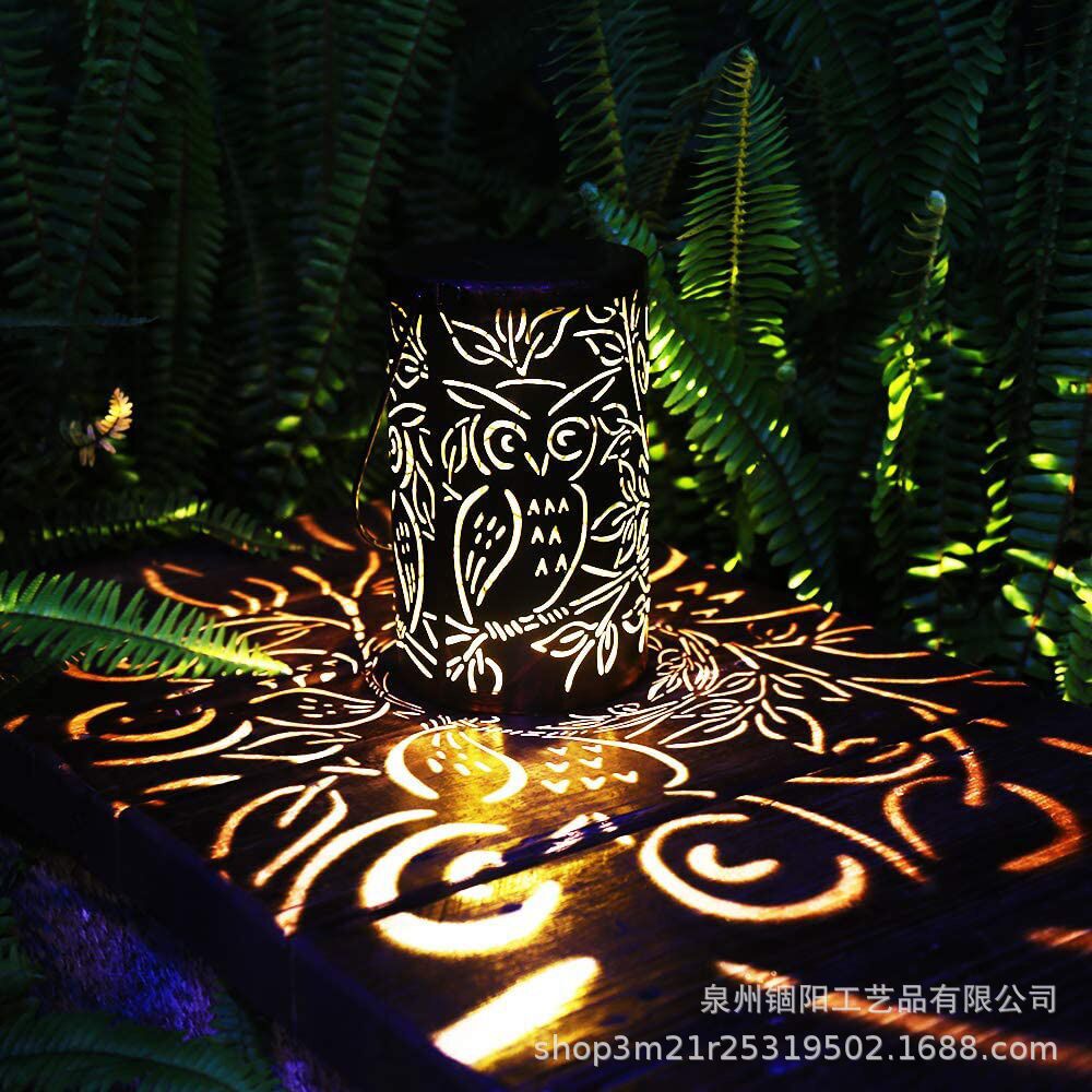 跨境太阳能灯笼创意猫头鹰铁艺镂空投影灯户外花园庭院装饰景观灯