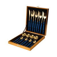 不锈钢葡萄牙镀金餐具套装金色木盒16件套餐具蓝金 缺货