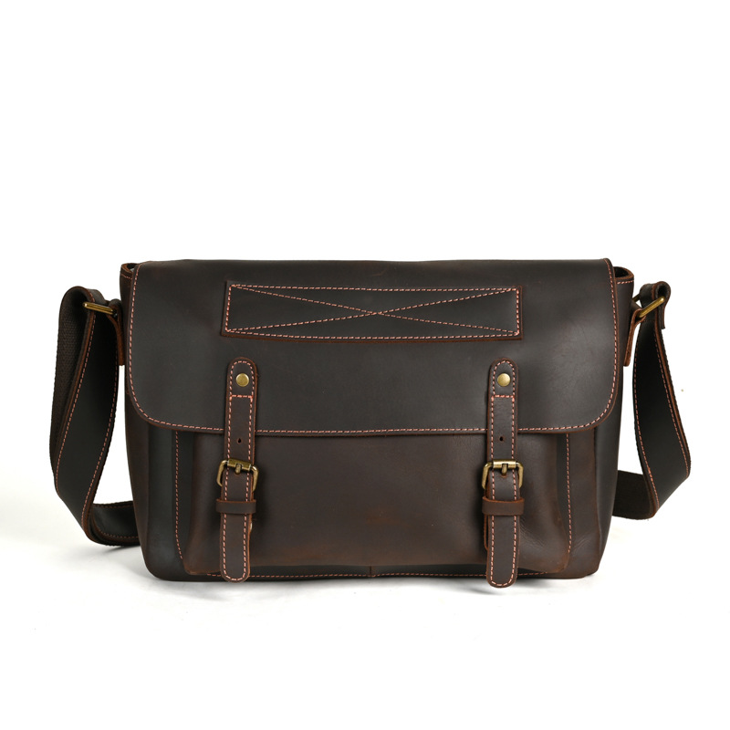 Crazy Horse Leather Vintage Men's One Shoulder Oblique Span Briefcase Leather Flap Multi functional Large Capacity Messenger bag