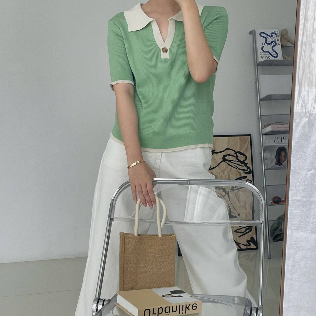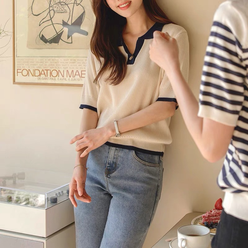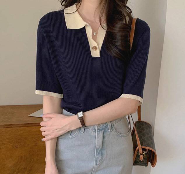 【chunyu】เสื้อคอปกตัดขอบสีทูโทน 8803