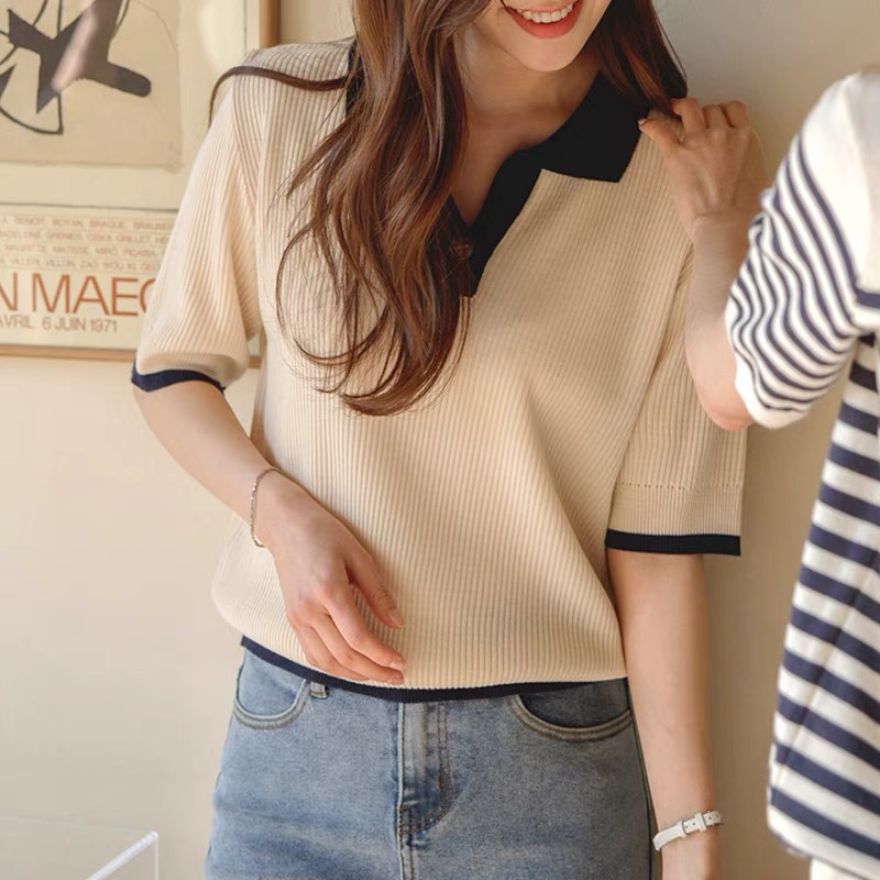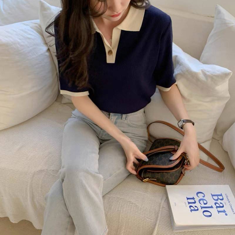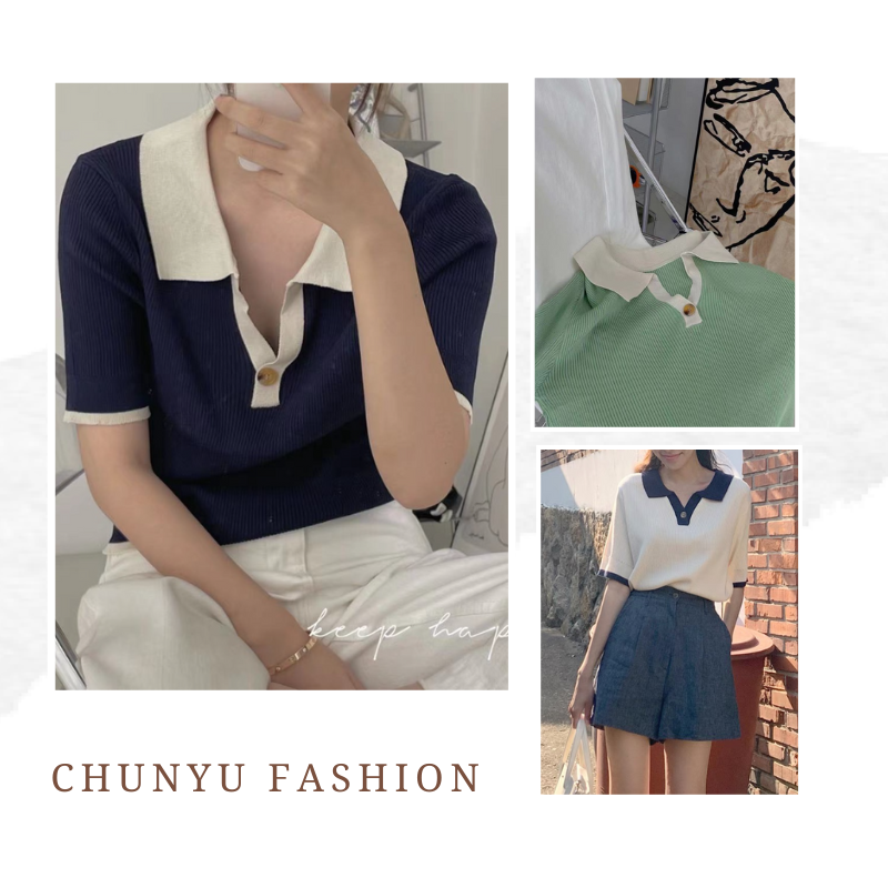 【chunyu】撞色休闲复古简约Polo领上衣8803