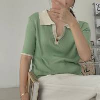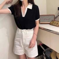 【chunyu】เสื้อไหมพรมคอปกตัดขอบ เสื้อครอปหญิง เสื้อผ้าผญสวยๆ 5694