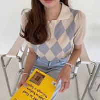 【chunyu】 เสื้อคอปก เสื้อโปโลไหมพรม ลายข้าวหลามตัด สไตล์เกาหล 8805