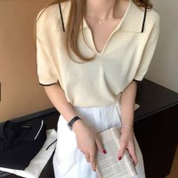 【chunyu】针织衫薄款女夏季韩版小清新v领撞色气质短袖t恤宽松显瘦短款上衣8846